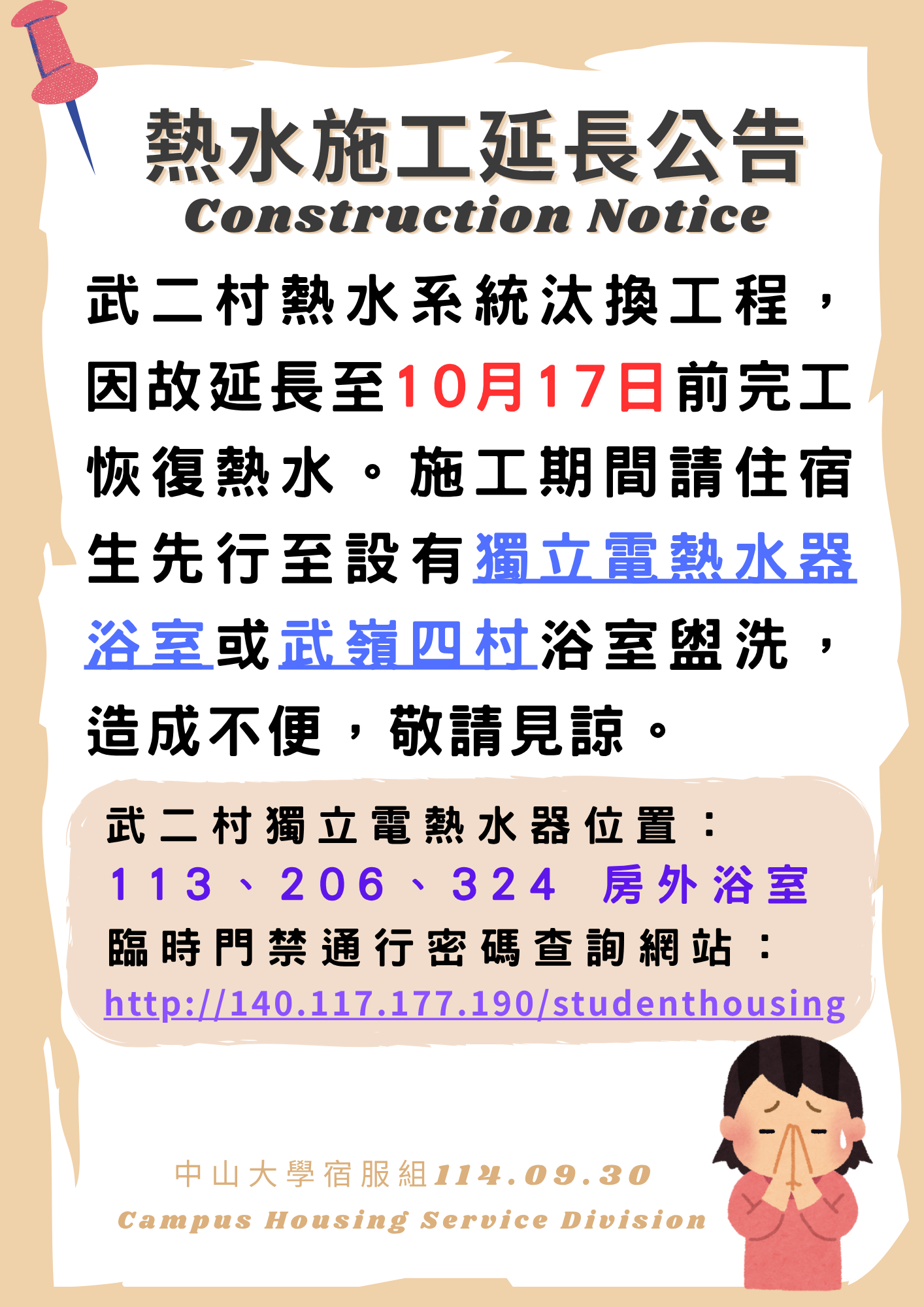 武嶺二村之熱水系統工程因故延長工期,預計10/17前完工並恢復熱水供應。施工期間請住宿生先行至設有獨立電熱水器浴室或武嶺四村浴室盥洗,造成不便,敬請見諒。