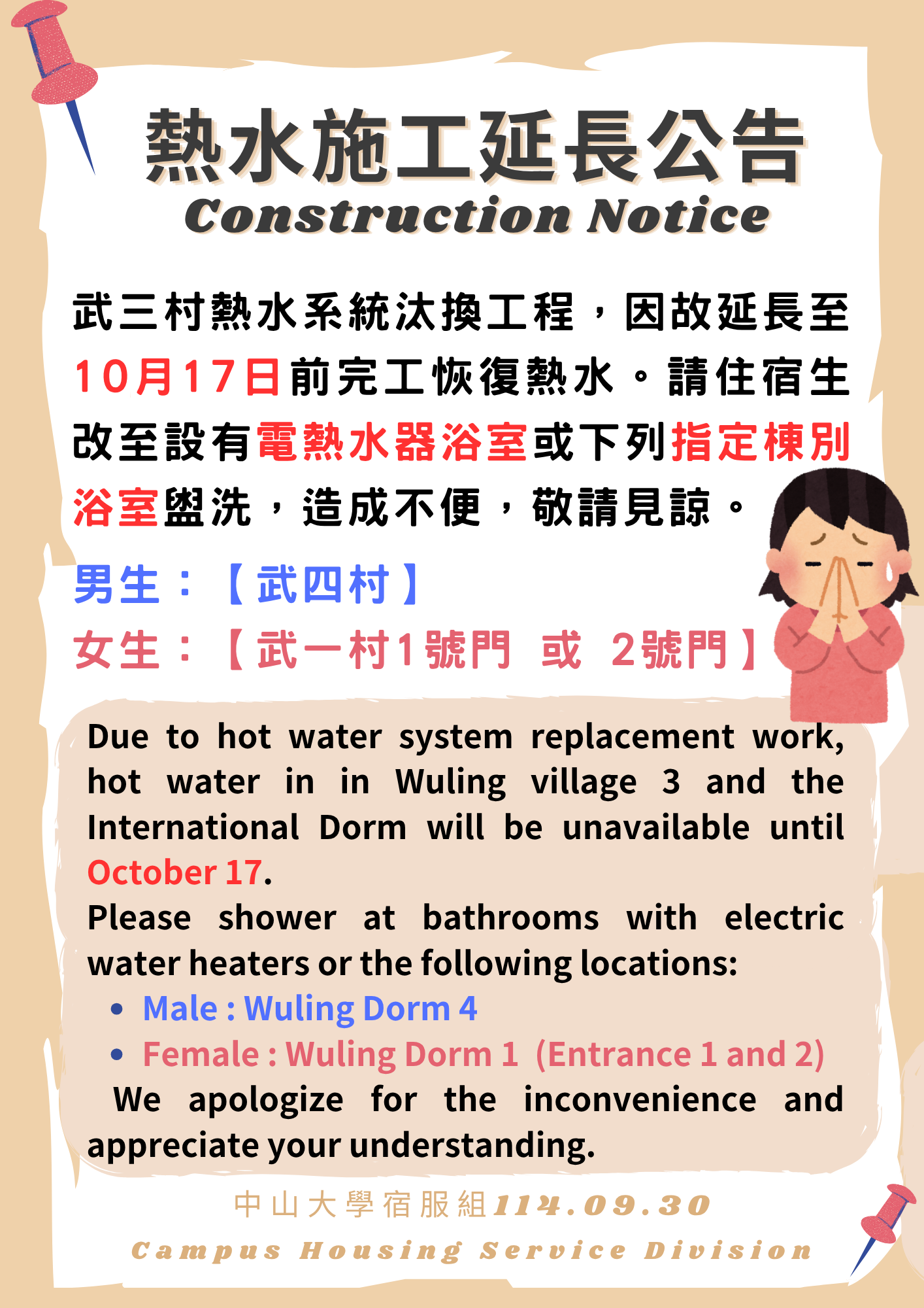 武三村熱水系統汰換工程,因故延長至10月17日前完工恢復熱水。請住宿生改至設有電熱水器浴室或下列指定棟別浴室盥洗,造成不便,敬請見諒。