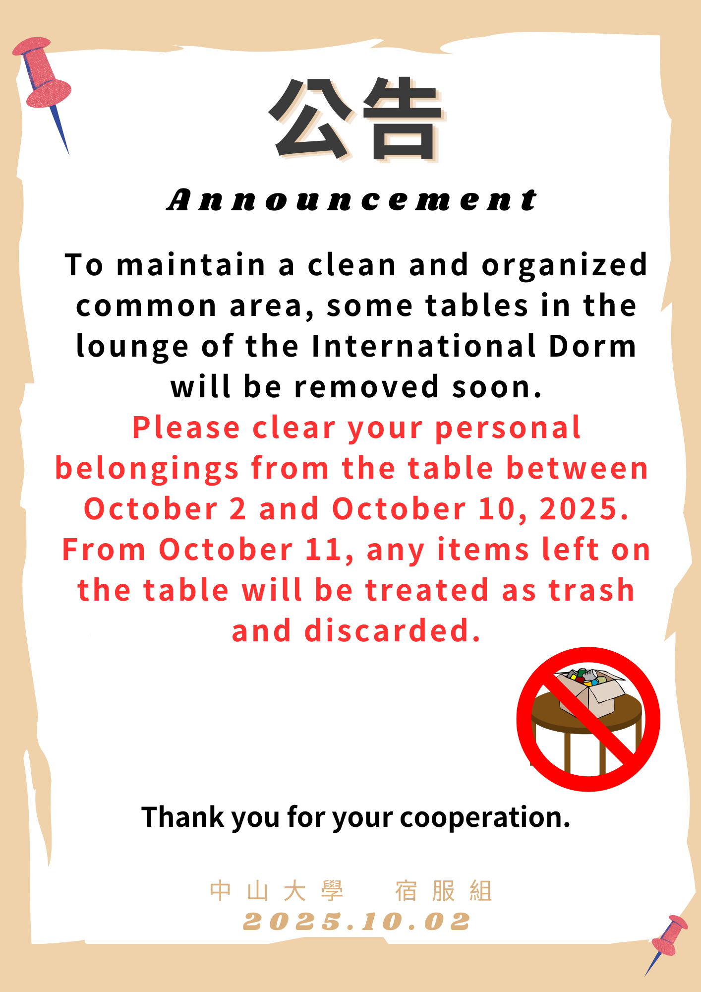 To maintain a clean and organized common area, some tables in the lounge of the International Dorm will be removed soon.