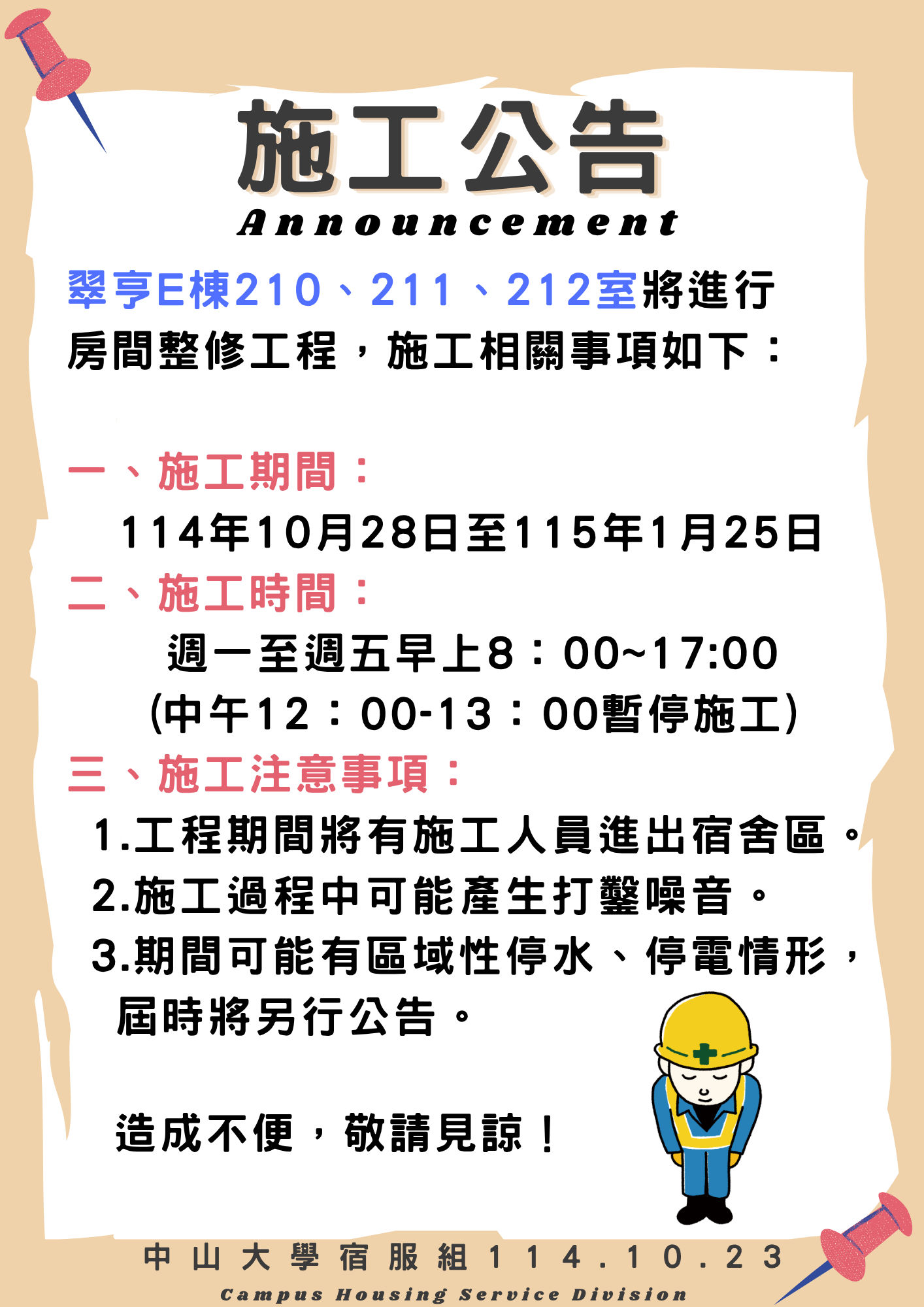 翠亨E棟210、211、212室預定進行房間整修工程,施工相關事項如下: