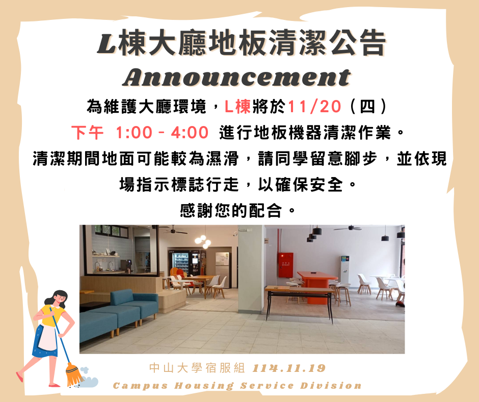 【公告】11/20 L棟大廳地板清潔公告