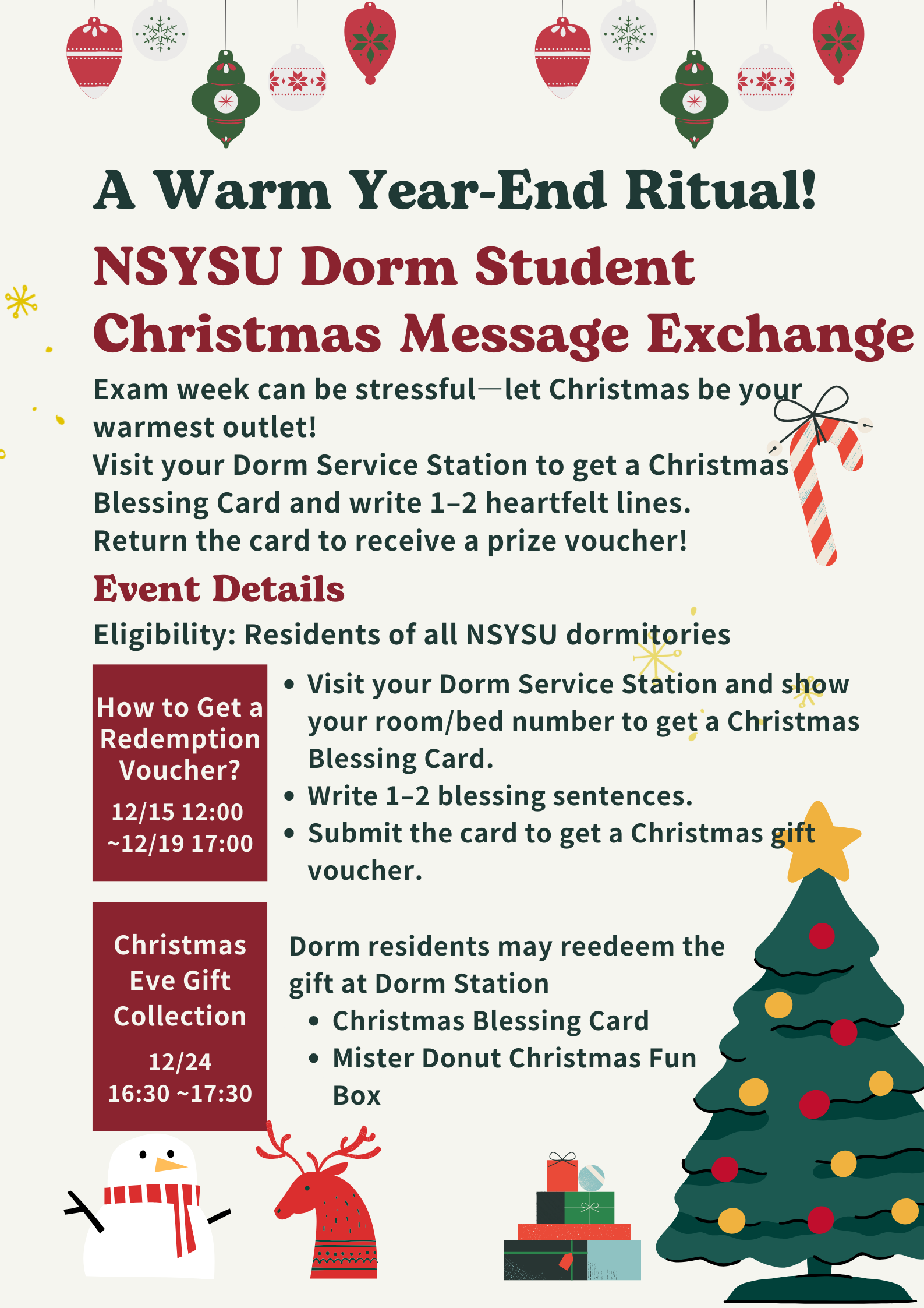 Visit your Dorm Service Station to pick up a Christmas Blessing Card and write 1–2 heartfelt lines.