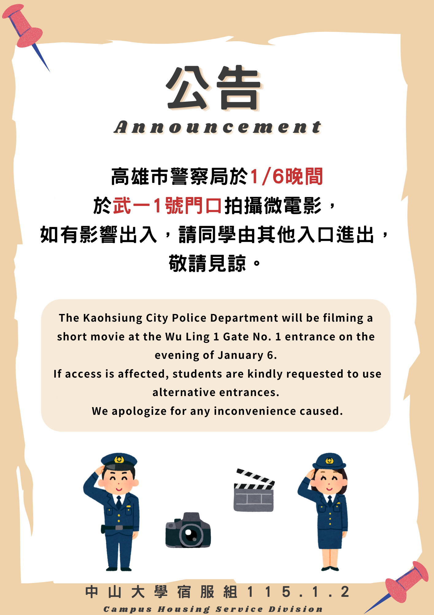 The Kaohsiung City Police Department will be filming a short film at the Wu Ling 1 Gate (Entrance No. 1) on the evening of January 6.