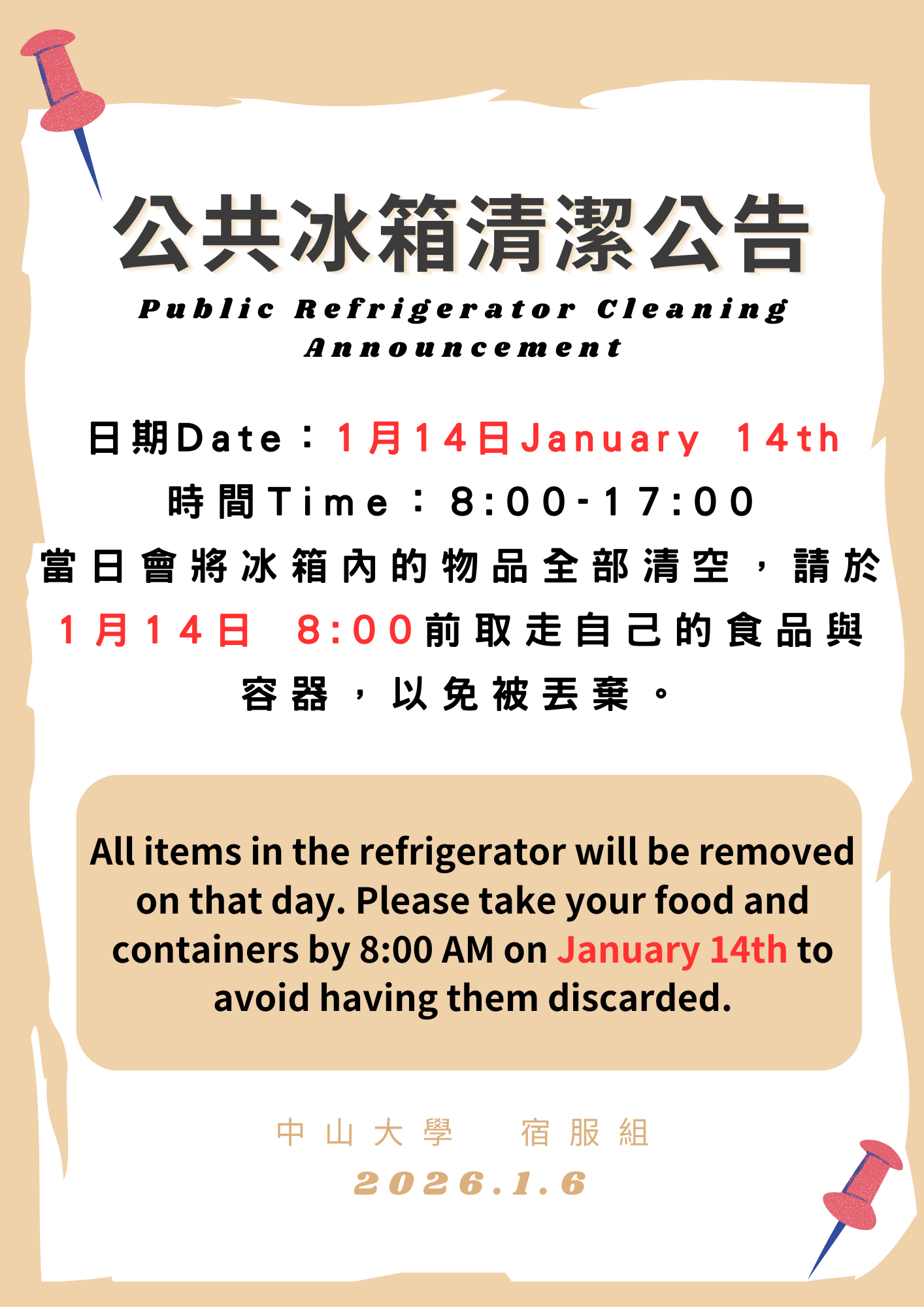 On January 14th, from 08:00 to 17:00, all items in the refrigerator will be cleared. Please remove your own food and containers before 08:00 on January 14th to avoid disposal.