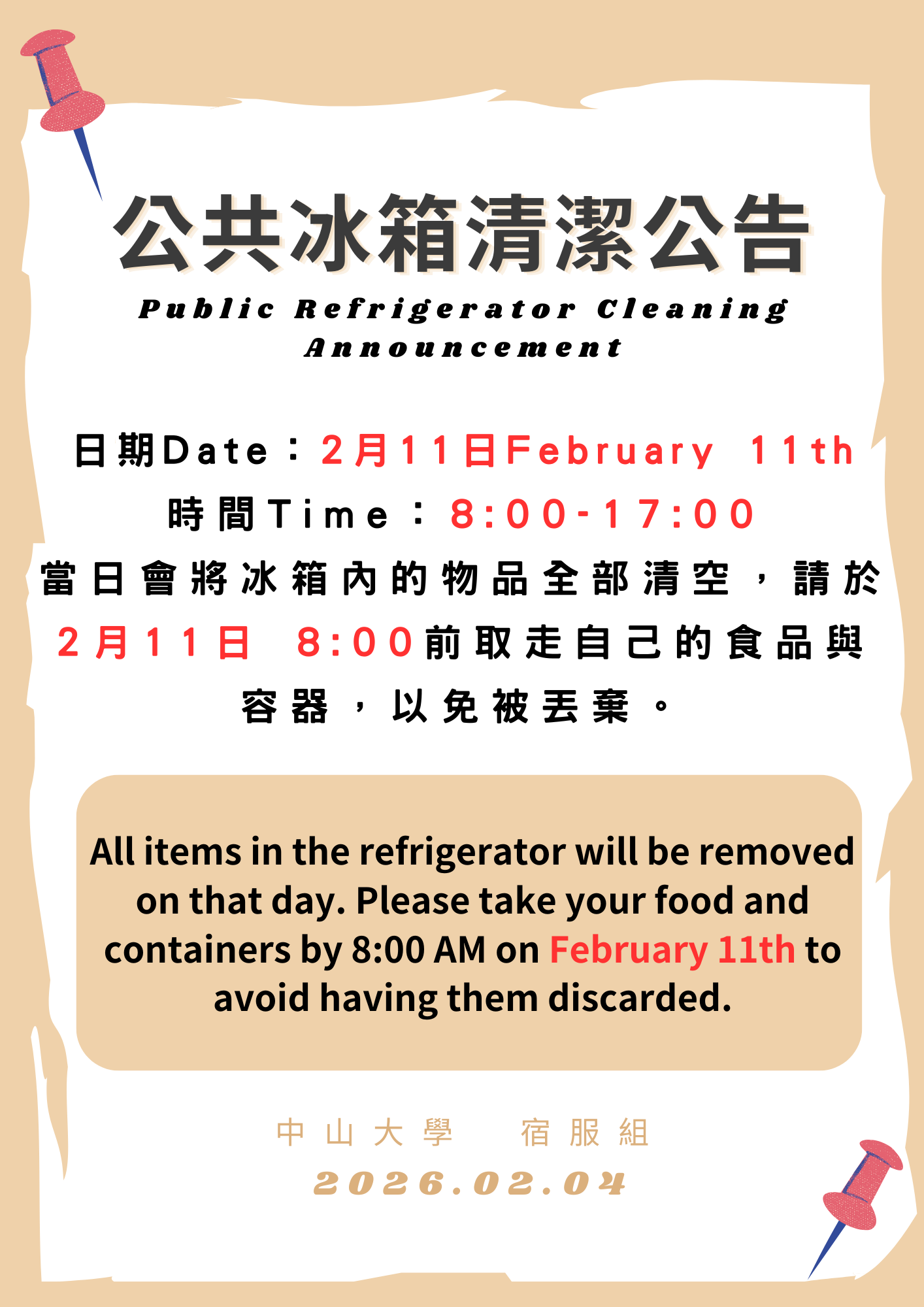 親愛的住宿生: 日期Date:2月11日February 11th 時間Time:8:00-17:00 當日會將冰箱內的物品全部清空,請於2月11日 8:00前取走自己的食品與容器,以免被丟棄。 宿服組關心您 115.02.04