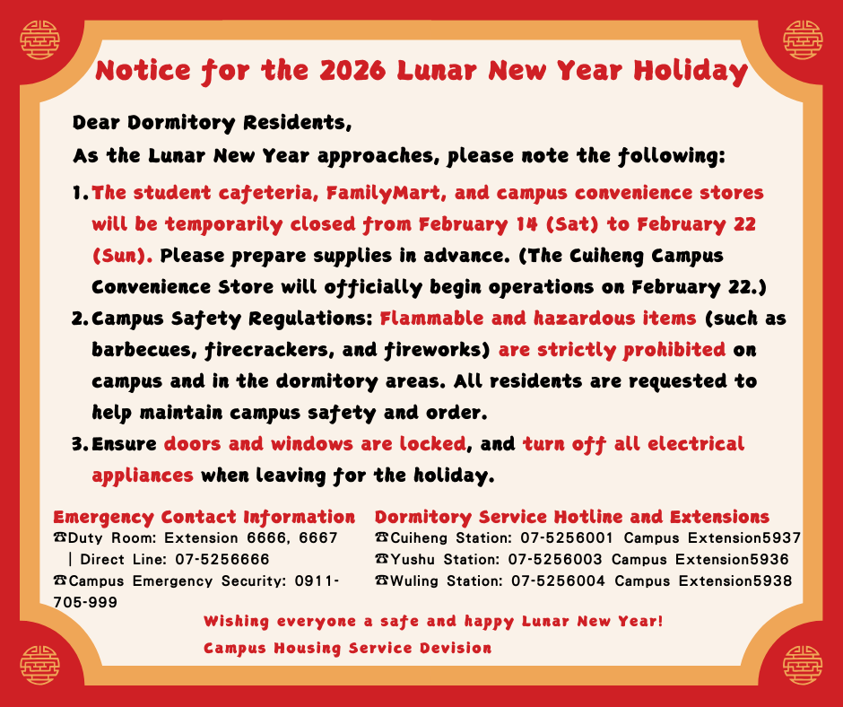 Store Hours: The cafeteria, FamilyMart, and on-campus convenience store will be closed from Saturday, 2/14 to Sunday, 2/22. Please prepare necessary items in advance. (Note: Cui-Heng Convenience Store will reopen on 2/22.)