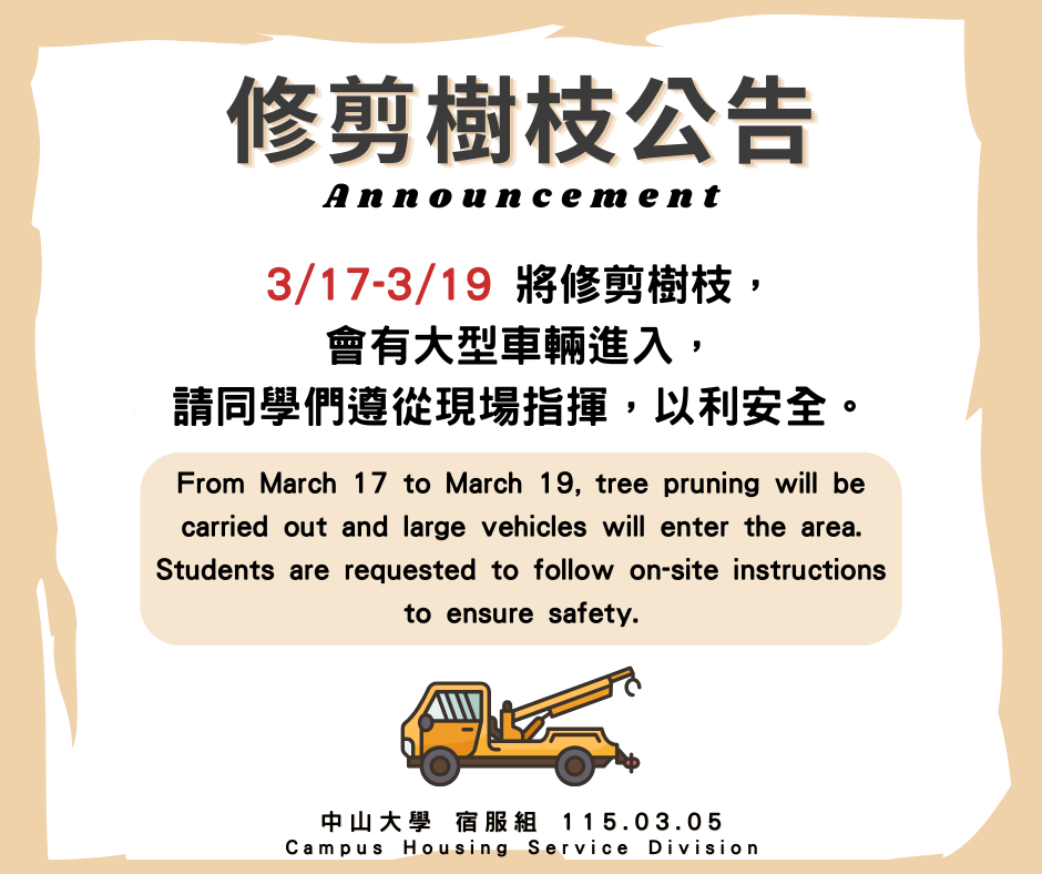 From March 17 to March 19, tree pruning will be carried out and large vehicles will enter the area. Students are requested to follow on-site instructions to ensure safety.