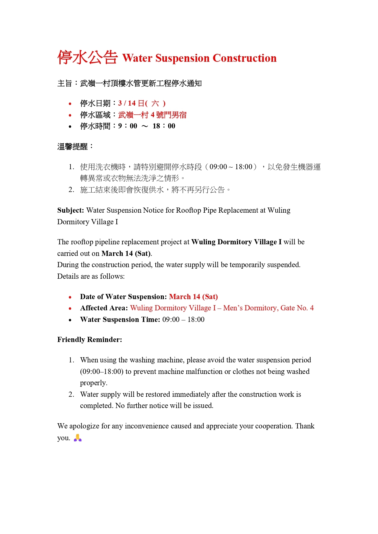 【公告】武嶺一村4號門男宿停水
